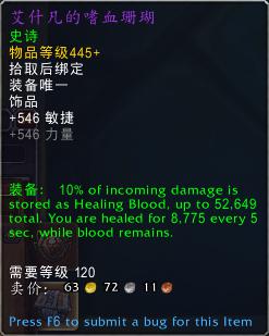 装备:10%的承受伤害作为愈合之血储存起来,最多总计52649点。当愈合之血存在时,你将每5秒获得8775点生命值治疗。