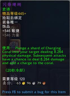 使用:将珊瑚碎片插入目标体内,造成8246点物理伤害。随后的攻击有机会造成8264点伤害,并给珊瑚增加一次充能。(20秒冷却)