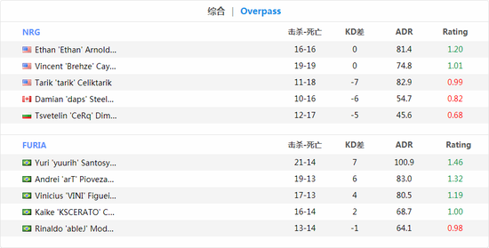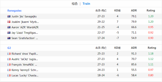许久不见的G2战队今日全员状态都较为不错,在Train上先执防守的他们轻松守下了牛仔们的多波外场爆弹、绿通同步等,以10-5的优势顺利领先半场。但攻防互换后双J组合的数次力挽狂澜让Renegades不断追分,最终双方拖入加时大战。在加时赛中G2顶住了压力,最终以19-17险胜。