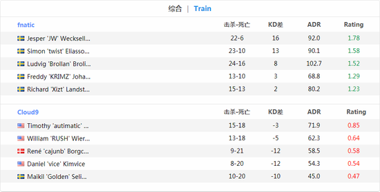 B组最后一场比赛由Fnatic对阵Cloud9,来到Train这张较偏CT方的地图上先行进攻的fnatic众人一波夹攻包点,Xizt和Brollan双人发力顺利赢下手枪局。今天小将Brollan的出色发挥非常关键,多次的突破率队顺利将比分领先至7-2。虽然在自动哥autimatic和Golden的出力下C9略起追分,但还是不终究还是不敌对手。攻防互换后再丢手枪局的Cloud9更是毫无机会,很快就以7-16负于对手。