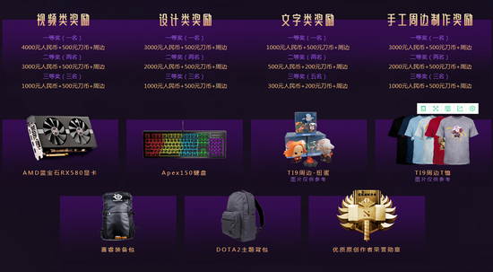 本活动将以2019年DOTA2国际邀请赛为主题进行内容征集,共分四大类,分别为:视频/音频类、漫画/原画/同人类、文字类和周边类。作者可选择任意一种题材进行创作,所有作品将经过初选——玩家投票——专家综合评估