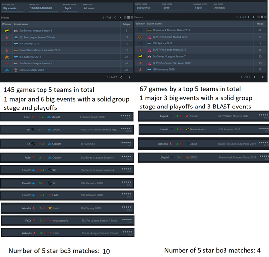 去年上半年没有 BLAST 赛事的情况下,世界排名 TOP 5 的队伍一共参加了 145 场比赛,其中包括一届 Major 和 6 项含有小组赛以及决赛阶段的大型赛事;而今年同期,TOP 5 队伍只打了 67 场比赛,其中一届 Major,3 项常规赛事和 3 项 BLAST 赛事。