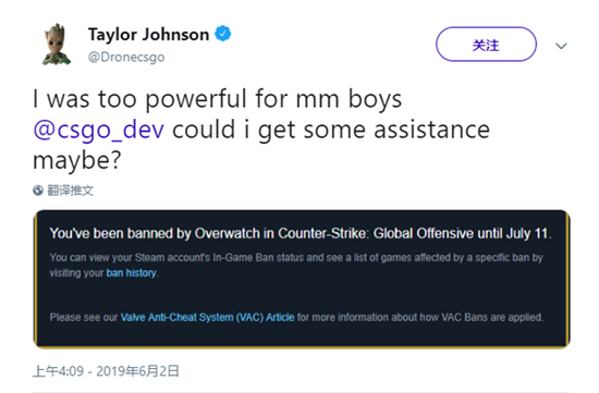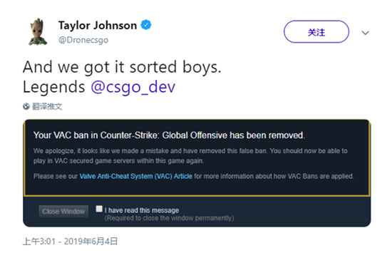 随即Drone就否认了这一说法并声明,之前一直在与朋友开黑并无恶意行为,这可能是滥用监管导致的错误定罪。这次监管封禁也导致Drone无法参加即将开战的StarLadder Major预选,因为他无法加入任何带有VAC的服务器。虽然StarLadder赛事方同意他使用其他账号参赛,但其资格是否有效还另有他说。最终Drone在推特发文称其封禁已经解除,表示V社“完美解决了问题”真是“传奇”公司。