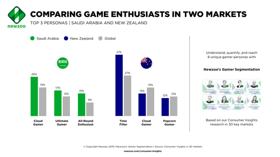 鉴于这两个市场巨大的差异, Newzoo 对沙特阿拉伯 8 个最富裕、最发达城市中 10-50 岁的游戏玩家进行了研究。此外,在确定沙特阿拉伯市场的目标群体时,也考虑到在该国居住的外籍人士占了较大比例,因此,该研究中的调查对象既包含当地人,也包含外籍人士。而在新西兰,Newzoo 则研究了该市场所有城市 10-65 岁的线上玩家。