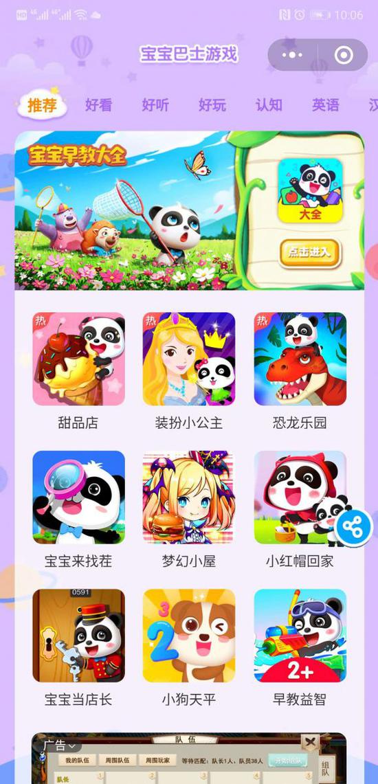 宝宝巴士是知名幼教品牌,在视频和传统APP领域都有很多产品出现,在国内颇受家长和儿童用户群体欢迎。宝宝巴士没有错过微信小游戏平台的机遇,推出了宝宝巴士游戏小程序,共集成了十多款款宝宝巴士自研的小游戏,还有幼教视频、儿歌、童话书和分学科的教学互动内容。宝宝巴士将小程序打造成了视听读写玩一站式体验的平台,涵盖了幼教的方方面面。