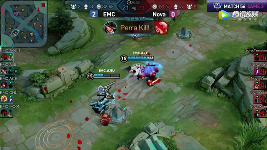 在EMC与Nova对决的第三局中,EMC在逆风情况下,被Nova进攻到水晶,并且团战先行减员。在Nova的消耗之下,再度减员至仅剩牛魔与AJIU的马可波罗两人。好在EMC众人在阵亡前对也将Nova的血线消耗近半,在牛魔放出大招后,AJIU也释放出大招进行收割,并利用Nova众人团战和推塔的犹豫瞬间一技能接平A完成最后的收割,完成了KRKPL历史上首个五杀,而EMC也凭借这一波团战的胜利,成功反推Nova,取得胜利。