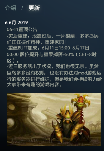 -近日服务器出了状况,我们也很无奈。虽然巨鸟多多没有权限,也没有办法对mod游戏运行的服务器进行维护,但是我们会持续努力给大家带来有趣的游戏内容。