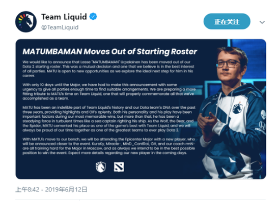 在SLI Minor打得火热的时候,另一边Liquid传来了竟然的消息,队内MATUMBAMAN马桶哥宣布离队。前不久还有外媒制作了图标Liquid五人共同作战了887天稳居第一,远远甩开第二名的PSG.LGD,然而这个真的是一口老毒奶,直接把Liquid奶散了。