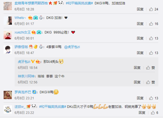虎牙直播在官方微博发布精英挑战赛的消息,评论里的留言几乎都是在为DKG打call,足以看出粉丝们对DKG的期待。在上一次的比赛中,不求人带领的DKG创造了单场最高伤害、单场最高击杀的亮眼成绩。这一次比赛与赏金赛的成绩相比,DKG 有了更大的进步。在不求人的带领下,DKG在比赛中表现出色,有过单局9杀的精彩战绩,满编十杀吃鸡的操作,让粉丝们看到了夺冠的希望。