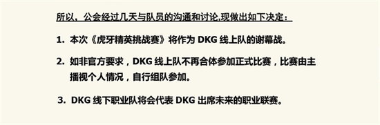 6月4日,作为DKG的公会大鲲之家在微博发布消息:“本次《虎牙精英挑战赛》将作为DKG线上队的谢幕赛。“在公告里,我们得知DKG四人承受的压力,以及他们为了电竞事业的付出。晚玉为了不让手汗影响比赛,决定做手术切割神经手术。冬季食物中毒强行直播,被平台要求下线休息。骚皮皮持续性高烧,每天仅减少1小时的直播时间提前休息。不求人因配合官网线下活动,体力透支仍坚持完成线下拍摄任务。