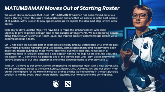 正当基辅Minor S2小组赛把把膀胱令人昏昏欲睡,哈欠连连的时候,一条突然出现的推送让人们猝不及防,顿时困意全无:液体官方宣布MATUMBAMAN离队,结束了近四年之久的液体生涯。