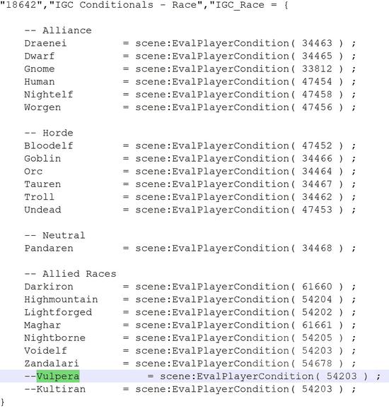 在scenescripttext.db2包中,有一个用于游戏角色出现的动画文件,有狐人的字段列在同盟种族内。这意味着暴雪在他们的游戏动画中正准备支持狐人作为可用种族。