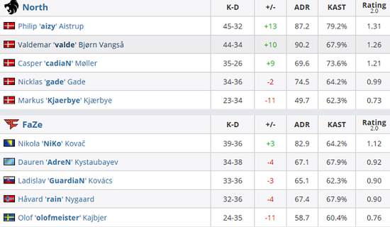 看完本场比赛,作为小编的我久久不能忘怀Niko比赛中那绝望的眼神。在图一的Train上,FaZe先做进攻方拿下4-1的开局后被院长valde狠狠的屠杀,随后的10分FaZe一分不拿,甚至只下了一次包。虽然下半场拿下手枪局,但起了,顶不住1v1对枪有什么好说的?就算Kjaerbye的发挥不尽如人意,但四只大腿在行走的North击败状态不佳的FaZe也是意料之中,最终FaZe以16-12输掉图一,除了Niko在本场打出81的场均伤害,其余四人都只有可怜的63左右的场均输出。