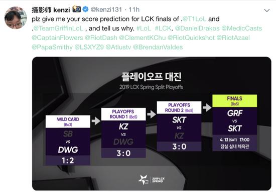 外媒摄影师Kenzi在推上发布了LCK赛果预测投票,邀请了欧美赛区多名解说进行预测: