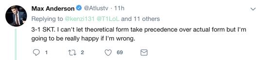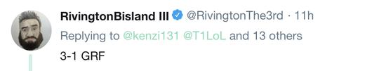LPL英文流解说Hysterics:3-2,SKT赢。SKT对阵KZ时的打法让我认为这场比赛最后会归结为一个瞬间,这个瞬间很有可能出现在史诗级的第五局中。感觉目前SKT比起Griffin在长时间的比赛中更胜一筹