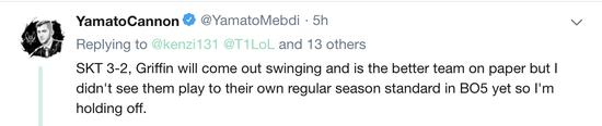 VIT教练Yamato:SKT3-2赢,Griffin会出现摇摆阵容并且纸面上是更强的队伍,但是我没有看到他们在bo5中表现出常规赛的实力,所以我不看好他们