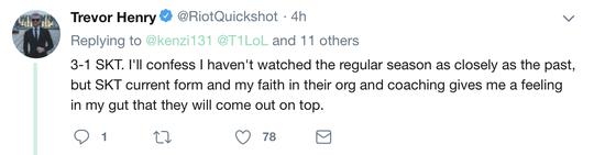 拳头解说Quickshot:3-1,SKT赢。坦白说这个常规赛我并没有像以前那样一直在关注,但是SKT现在的状态以及我对该俱乐部和教练组的信心让我有种直觉,他们会重回巅峰