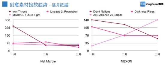 韩国地区,Net Marble去年面世的《Iron Throne》创意数量最多,而今年二月份投放量明显下滑,其创意素材类型以视频和Html为主,投放渠道为Facebook、Audience Network、UnityAds、头条、腾讯社交广告等;NEXON旗下几款创意数量较多的游戏整体表现差异不大,月度趋势中的《AxE: Alliancevs Empire》投放量明显持续上升,而其余两款则处于下滑。创意素材方面,韩国较少使用图片广告,投放渠道也更加偏重覆盖全球的头部流量。