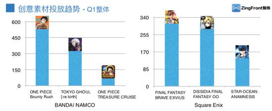 日本地区,BANDAI NAMCO旗下新款手游《One Piece Bounty Rush》的整体创意素材量最高,尤其是二月份创意素材量增长明显;较为擅长RPG游戏的Square Enix在Q1创意素材数量最高的是《FINAL FANTASY BRAVE EXVIUS》,进入三月后呈回落趋势。创意素材多以视频和Html为主,投放渠道集中于Facebook、Google Adwords、Audience Network、UnityAds等。