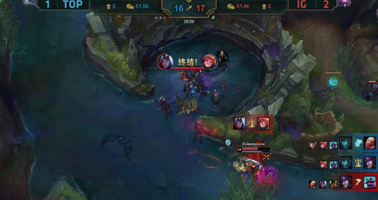 陷入迷茫的iG野辅先被击杀后,TOP随即开启大龙团。iG三C在龙坑打出了足够的输出,吸血鬼成吨的AOE造成巨额伤害,最终维鲁斯完成了收割。最后iG顺利拿下对大龙的控制,一波战胜了对手,恭喜iG杀进总决赛!
