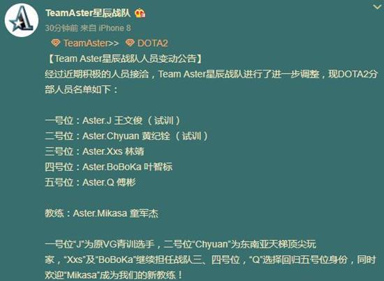 Team Aster在刚刚发布阵容公告,宣布新一轮的人员调整。新人J和Chyuan加入战队进行试训,分别担任一二号位。此外,传奇教练Mikasa加盟Aster,担任教练一职。