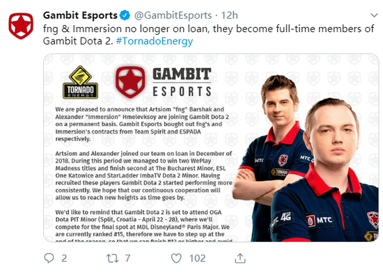 日前,Gambit发布推特,宣布fng和Immersion这两位选手将正式成为Gambit一员,而非之间的租借队员。