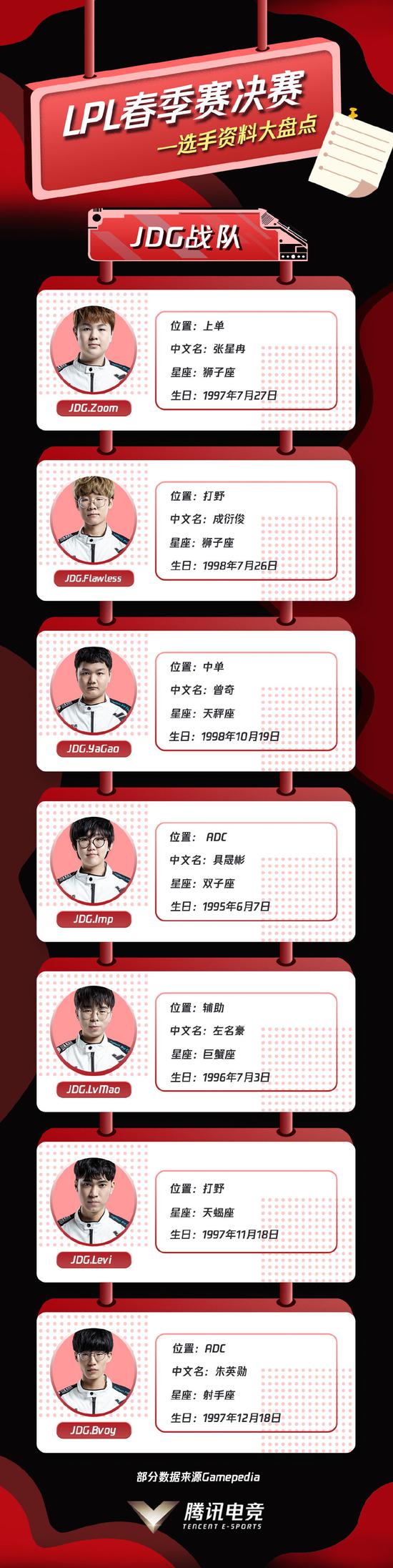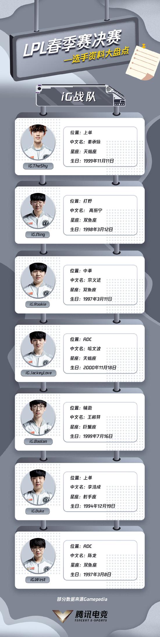 腾讯电竞发布了两张长图,展示了2019LPL春季决赛双方JDG和iG选手们的一些小资料。包括各位选手的年龄和星座。