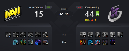 10分钟双方在上路爆发第一波团战,KG完成一换三,NaVi双大哥都阵亡,KG人头数12:9领先。之后两边频频爆发战斗,还是KG小优。但NaVi的幽鬼通过几波收割,经济起得非常快,是一个很大的隐患。