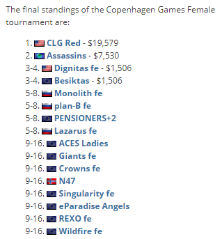 哥本哈根CSGO女子组所有队伍排名及奖金分布: