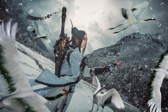 意境唯美的一套作品。前期构图好看,Coser的动作神态也都很贴合角色。后期是减分项,鹤比较假,和背景融不到一起。叠加的特效太多,显得画面很乱。