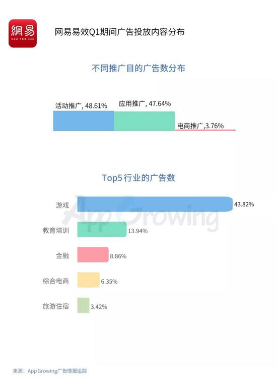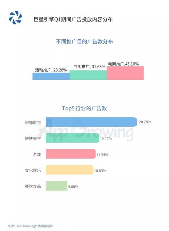 在腾讯广告Q1投放的广告中,落地页为活动推广及应用推广的广告占比区别不明显,活动推广类广告数占比41.50%,而教育培训、文化娱乐、金融、护肤美容及服饰鞋包行业为该平台广告数Top5的行业。