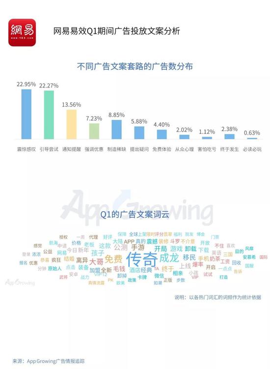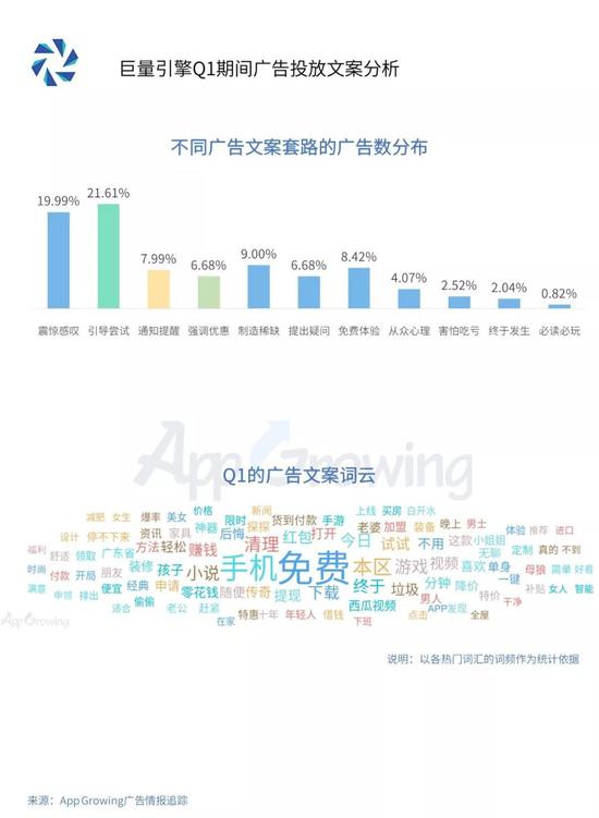 引导尝试类与震惊感叹均为其重点使用文案套路,“免费”及“手机”为该平台广告文案的高频词汇。
