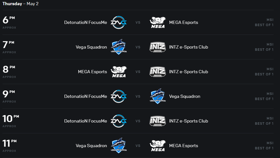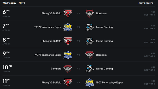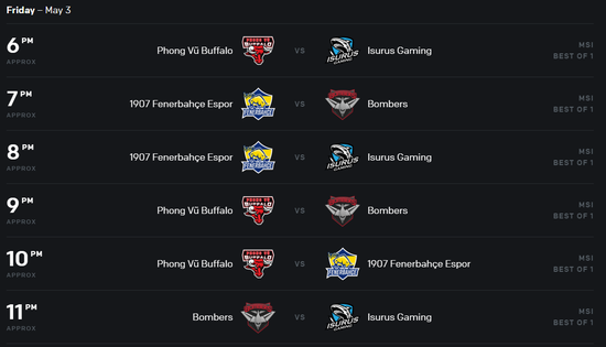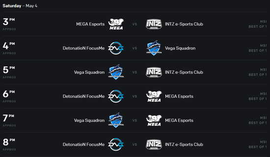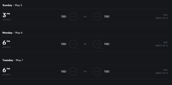 两个组的出线队伍将在5月5日开始的淘汰赛与LCS赛区的冠军队伍Team Liquid和LMS赛区的冠军队伍闪电狼进行双败赛制,决出三个出线名额进入MSI的正赛阶段,与LPL LCK LEC的冠军队伍争夺2019MSI的冠军。