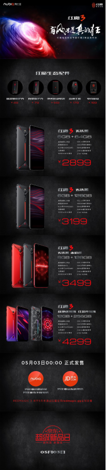 红魔3拥有6GB+64GB、6GB+128GB、8GB+128GB及顶级12GB+256GB四款配置;其中6GB+64GB、6GB+128GB采用玄铁黑配色,其售价分别仅为2899元、3199元;同时8GB+128GB配置拥有玄铁黑、赤焰红两款颜色,售价为3499元;此次12GB+256GB顶配则有战地迷彩与红蓝竞技版两款颜色,售价4299元。红魔3将于5月3日0点在努比亚官网、努比亚线下体验店、努比亚京东旗舰店开启首销,京东商城也将在5月3日开启红魔超级新品日,敬请关注。