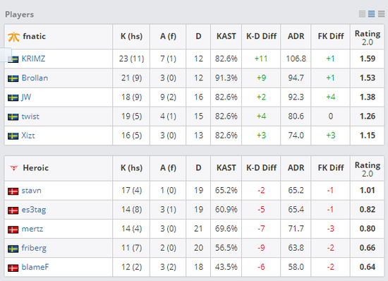 瑞典战队fnatic面对到来自丹麦的Heroic,上半场防守方的fnatic凭借KRIMZ和小将Brollan的稳定发挥并没有给Heroic太多机会,上半场11-4大比分领先,而下半场Heroic的防守又被fnatic随意突破,11个赛点让他们无力回天,最终被fnatic16-7轻松战胜。