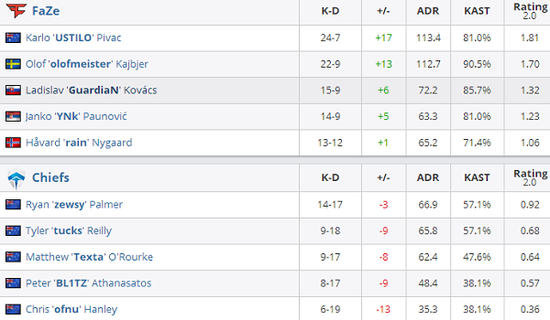 作为救火队员的USTILO在本场比赛打出几乎超越Niko的表现,化身队内大腿的他协同奥拉夫在上半场的防守方将对手按压在包点之外,均奉献出113Adr也帮助残阵FaZe顺利在防守方拿到10分之多。而下半场的进攻方更是银河战舰的天下,FaZe连斩6分以16-5轻松取胜。