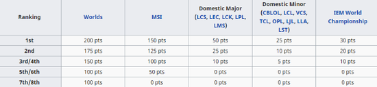 季中冠军赛(MSI):第一名 150 分 第二名 125分 三、四 100分 五、六 50分