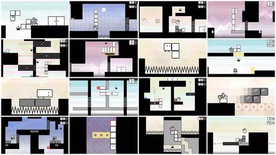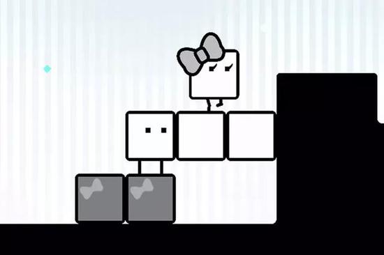 《纸箱男孩+纸箱女孩》的画面采用极简卡通风格,从游戏截图来看,“纸箱男孩”和戴蝴蝶结的“纸箱女孩”两个方块由两位玩家操控,主角方块可以生成另外两个方块帮助自己突破各种障碍,破解谜题,最终到达终点,近似于益智版的双人超级马里奥。