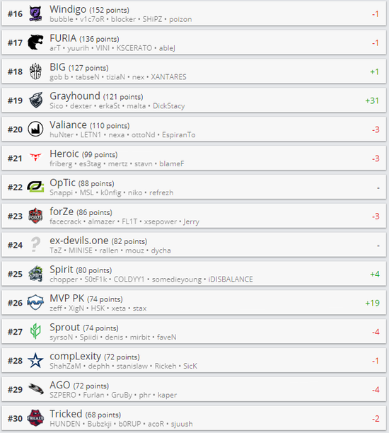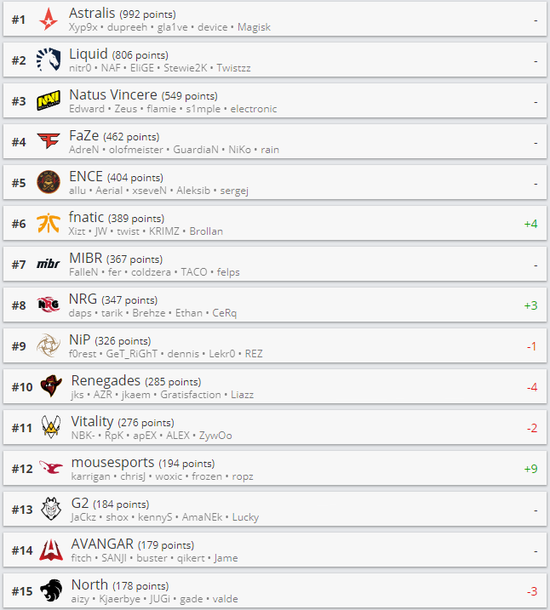 在本月,刚刚结束的 IEM 悉尼站的战绩对本次排名产生了较大的影响,但未参与此项赛事的 A 队仍稳居第一的宝座。拿下亚军的 fnatic 上升至第六名,这也是他们继今年一月以来的最高排名,昔日赛场霸主能否再次回归巅峰呢?