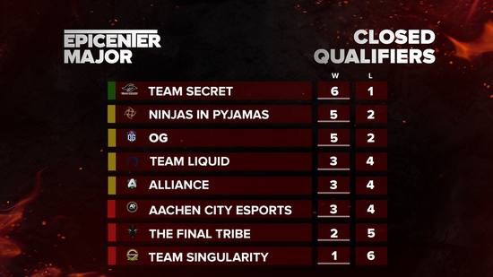 刚刚在MDL上拿到冠军的秘密并没有停下自己的脚步,震中杯预选赛的第二日,尽管在同液体的对决中不慎落败,但秘密最终还是以六胜一负的成绩锁定了欧洲区的第一个名额。而于昨日拿下四连胜的OG,则先后遭遇了NiP和秘密的狙击,以五胜两负的成绩位列小组第二。