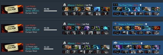 第一天发挥不错的Alliance,在第二个比赛日先后负于秘密、NIP和TFT。这其中,输秘密是情有可原(30分钟准时暴打),但后面两次失利就有点不太应该了。输NIP的那次,A队虽然一度在对线期占到了很大的优势——尤其是快播哥的蓝猫,将FATA的火猫死死压住。但随着游戏进入中期,ACE的巨魔逐渐发力。肉山团战的溃败让A队丢掉了前期的所有优势,而在有了BKB和林肯后(没错,BKB林肯的火猫),FATA也变得没那么容易白给。43分钟,NIP实现逆转。至于后面A队输TFT的这局,让人隐约察觉到一股自暴自弃的味道。比赛中,两支队伍的节奏都让人看的昏昏欲睡。由于没能挡住Frost的水人,Alliance再丢一分。