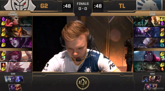 第一局比赛前期CoreJJ有点浪,在G2四人面前非要Q一下一级被打出闪现。抓住塔姆没有闪现皇子下路疯狂搞下路,连续击杀两次塔姆,船长为了支援也传送送了一波。TL之后下路就完全打不过了,Perkz霞11分钟连拿五个人头。