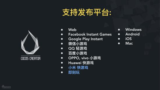 作为一款免费的开源移动跨平台游戏引擎,除原生平台之外,Cocos 截止目前已经率先完成了对以下小游戏平台的支持,包括微信小游戏、QQ 轻游戏、OPPO、vivo 小游戏、Huawei 快游戏、百度小游戏、小米快游戏、即刻玩平台,海外的 Facebook Instant Games、Google PlayInstant 等。每支持一个新平台,Cocos 都能提供相应的编辑器工具链、文稿和范例,一次开发,全平台部署,帮助开发者实现利益最大化。