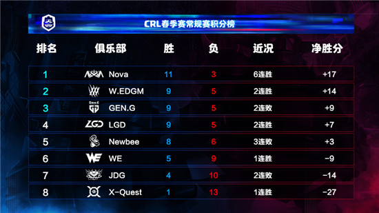 此外,除了Nova继续一骑绝尘实现常规赛三连霸外,常规赛第2-4名的队伍战绩完全一致,排名争夺更是胶着到需要计算小分的程度,一超多强的格局已然形成。名列第五无缘季后赛的Newbee距离前四仅有一场差距,晋级季后赛的悬念直到最周一周的最后一场比赛才揭晓,CRL的观赏性和悬念性都较前两赛季有了极大的太高。军备竞赛不但缩小了各支战队间的差距,也让赛事比拼变得更加激烈,各种强强对话应接不暇让所有观众大呼过瘾!