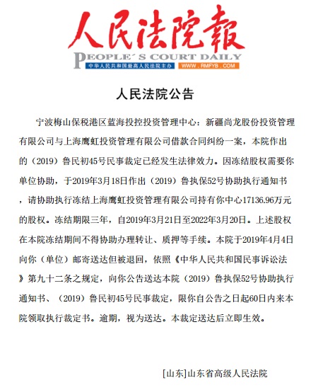 山东高院称,此次冻结缘于鹰虹投资与新疆尚龙股份投资管理有限公司(下称新疆尚龙)的借款合同纠纷案。新疆尚龙为朗源股份的控股股东,今年3月末,其仍持有上市公司21.35%的股份。