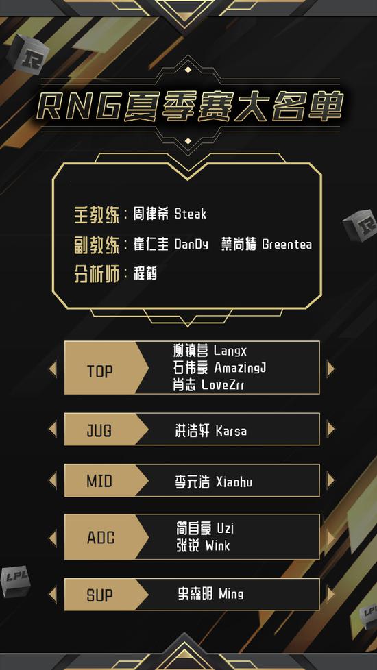 RNG电子竞技俱乐部英雄联盟分部2019年夏季赛大名单: