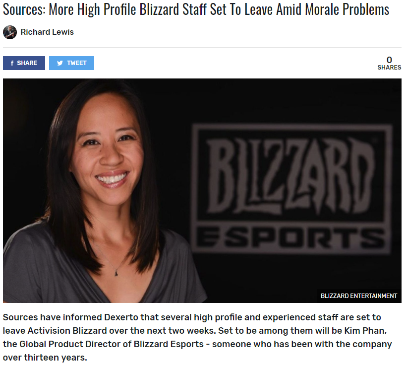 《守望先锋》职业联赛的主管 Nate Nanzer 前不久也刚刚离开暴雪加入 Epic Games(可能主持《堡垒之夜》和《火箭联盟》电竞相关项目),尽管暴雪最新的股东大会自豪地宣布了“创纪录的收入年度”,但员工的离职有继续为 Activision Blizzard 带来负面新闻的趋势(包括之前的裁员)。同时暴雪也因为其《暗黑破坏神:不朽》手游宣发时的一句 “do you guys not have phones?”而备受争议。