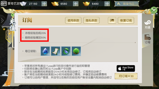 针对苹果高端机除了在视觉体验上具有更加卓越的表现,游戏中还加入了iTunes订阅功能,方便自动续订,附赠订阅BUFF,为玩家的江湖之行保驾护航。