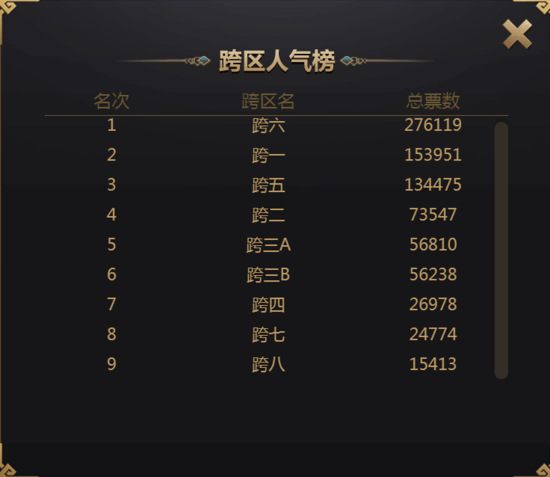 精彩的赛事当然少不了勇士们的支持。在跨区人气榜中,目前跨六以276119的投票暂居榜首,在之后的比赛里勇士们也请多多支持自己跨区的战队,为自己的跨区投出你的一票吧!最终获得胜利的跨区队伍,该跨区勇士还能额外获得福利哦!