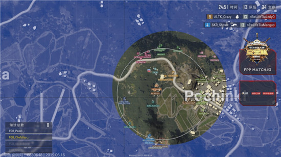 随后安全区逐渐向Y城方向刷新,Y城西南侧麦田内随后发生了持续性混战。26分钟时,第六安全区向南部米奇妙妙屋靠拢,此时场上剩余10支队伍30左右生存。麦田方向的FGB、DGG、CSG等队开始设法逐渐向南部前进。30分钟,FGB独狼车夫在圈边完成了对CSG的一穿四天秀表演!